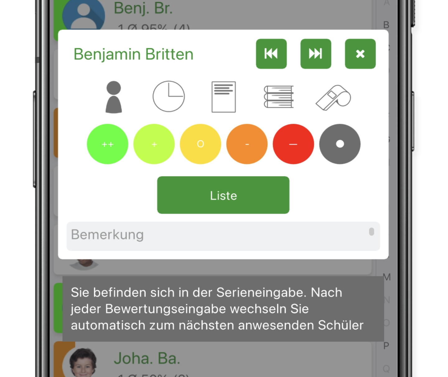 Für systematische Bewertungen der Mitarbeit ist die Serieneingabe optimal. Wird dies regelmäßig gemacht, ergeben sich relativ objektive Mitarbeitsnoten. Als fehlend gekennzeichnete Schüler werden bei der Serieneingabe automatisch übersprungen.