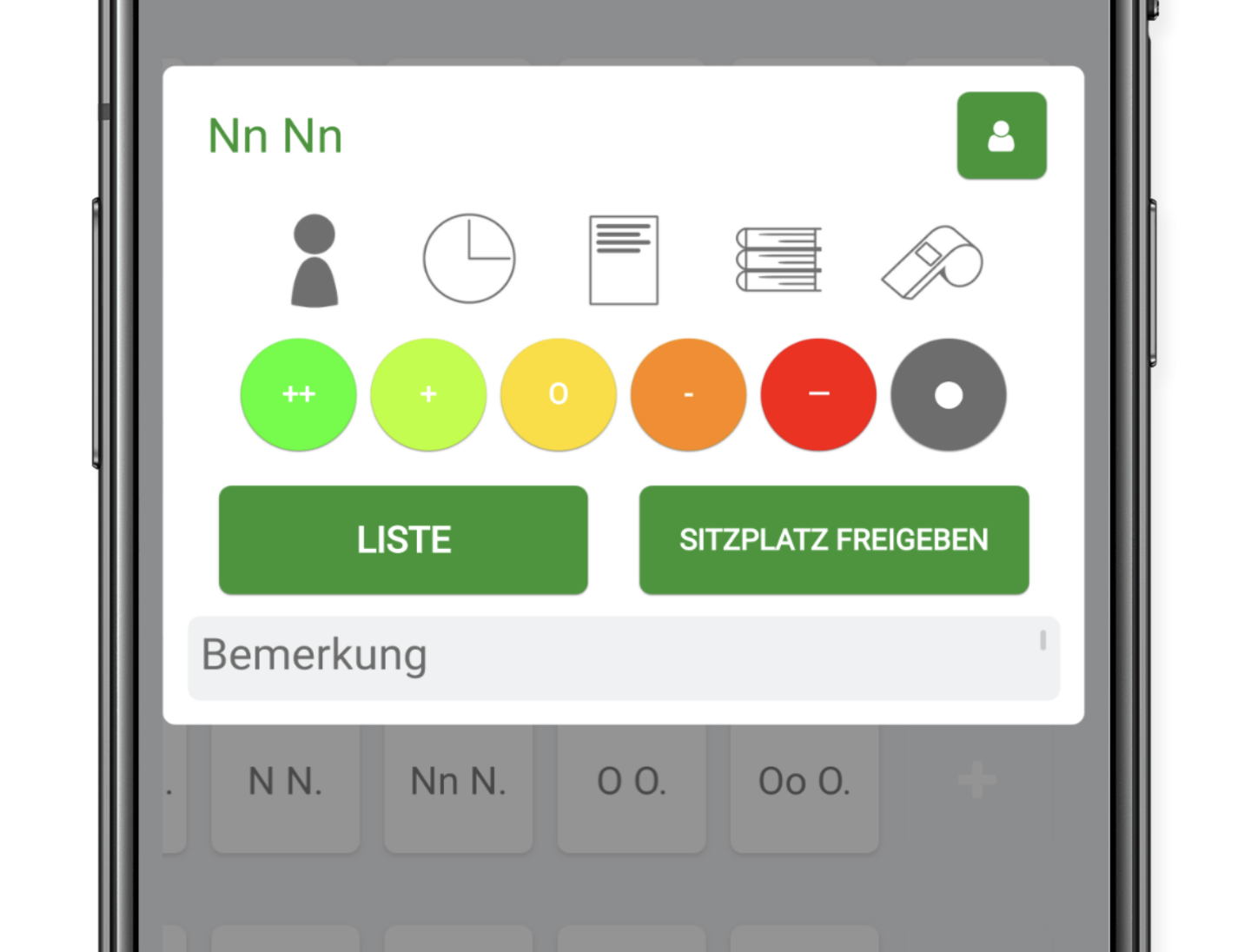 das geht ganz identisch wie in der Schülerliste. Der einzige Unterschied ist, dass sich im Bewertungsoverlay der Button: "Sitzplan freigeben" befindet. Ein Klick darauf entfernt den Schüler von diesem Sitzplatz.